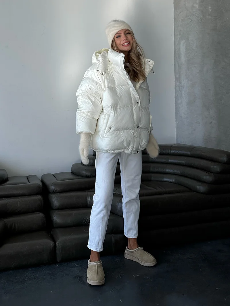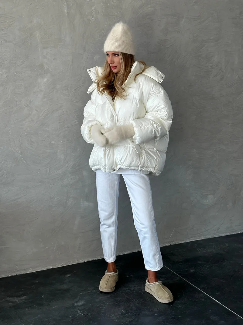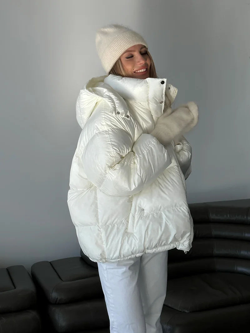 Žieminė pūkinė striukė su pieno spalvos gobtuvu